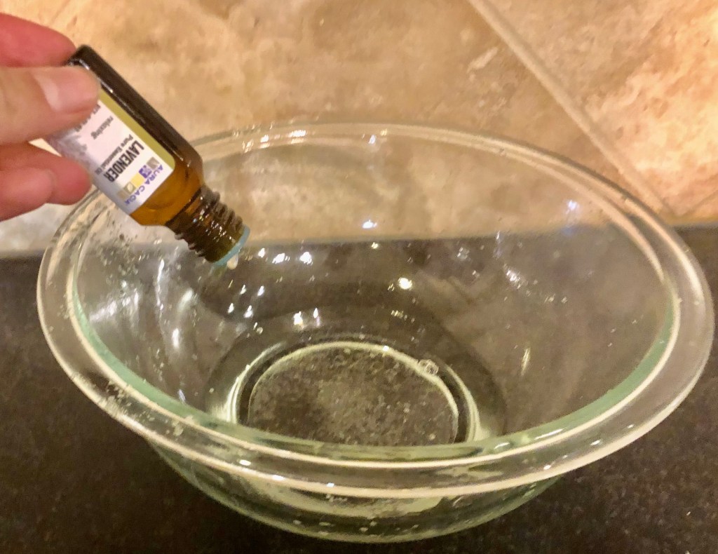 Once your coconut oil or olive oil is melted then add your essential oil of choice (I like to use lavender.)