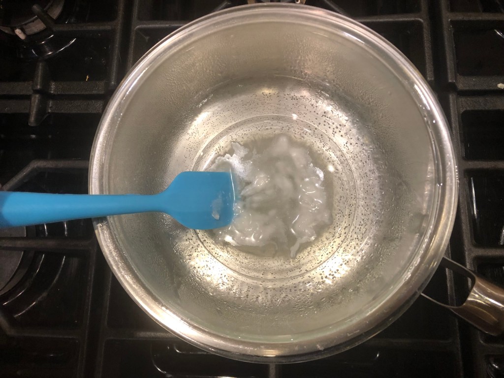 Begin by melting your coconut oil over a double boiler (you could also do this in the microwave.) You need to watch the coconut oil carefully, make sure to heat it only until it melts or is almost melted. If you are using olive oil then you can skip this step.