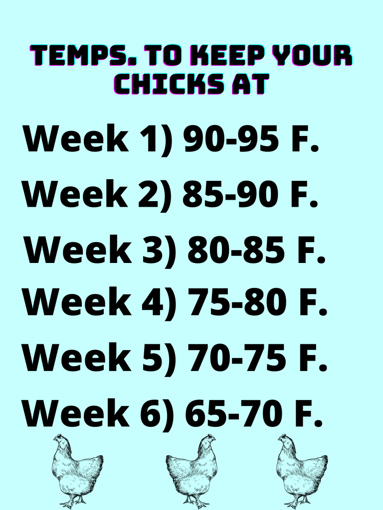 Chicks for their first week of life need to be kept at 90-95 F. It is super important that you keep the chicks at the proper temperature so that they grow properly and stay healthy.