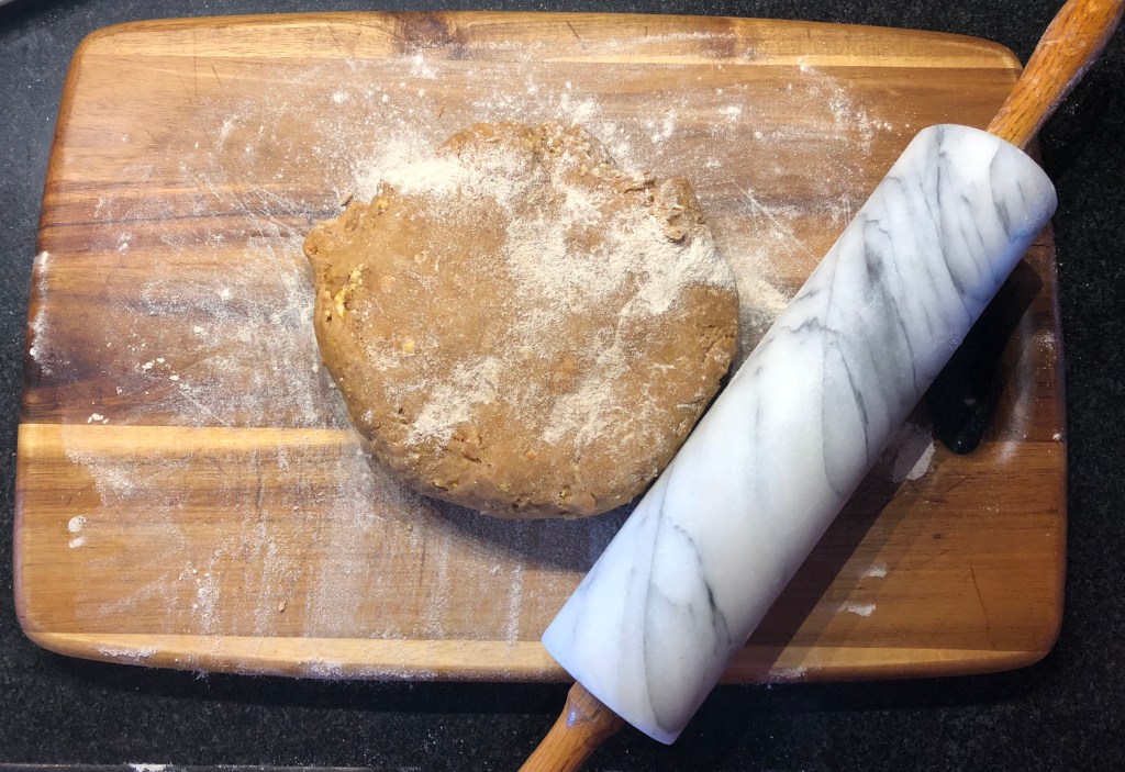 - In a large bowl combine the flour and egg. Then add in the peanut butter, honey, and water until you have a stiff dough (it will become very firm and sticky.)